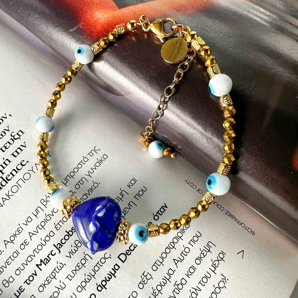 Χειροποίητο κομψό βραχιόλι από το εργαστήριο μας για μια λαμπερή προσθήκη στη συλλογή σας. Με μία κεντρική μπλε πέτρα Murano σε σχήμα καρδιάς που αναδεικνύει την κομψότητα του και σε...
