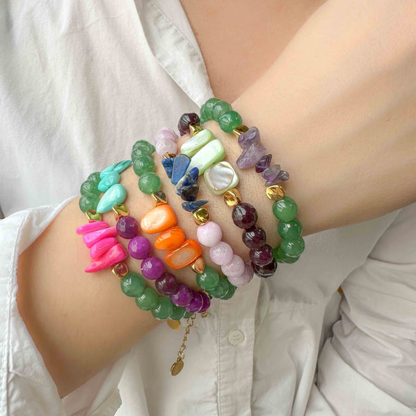Το εργαστήριο elephantina έφτιαξε ένα βραχιόλι γεμάτο χρώματα και κομψότητα ! Ένα κόσμημα με στυλ, ημιπολύτιμες χρωματιστές πετρες ακανόνιστου σχήματος και λευκό μαργαριτάρι μεγέθους 10-11mm. Το κούμπωμα και η αλυσίδα αποτελούνται από ατσάλι και δεν προκαλούν αλλεργίες....