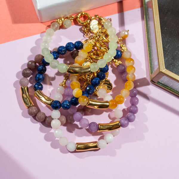 Χειροποίητο βραχιόλι με ημιπολύτιμες πέτρες από αχάτες. Οι επίχρυσες λεπτομέρειες προσθέτουν πολυτέλεια στον υλικό του ορείχαλκου. Το χρώμα του βραχιολιού αναδεικνύει την κομψότητά του.